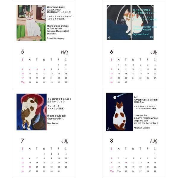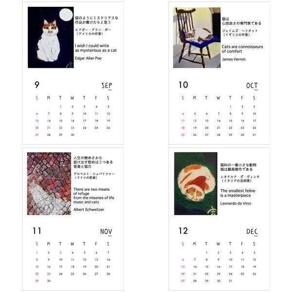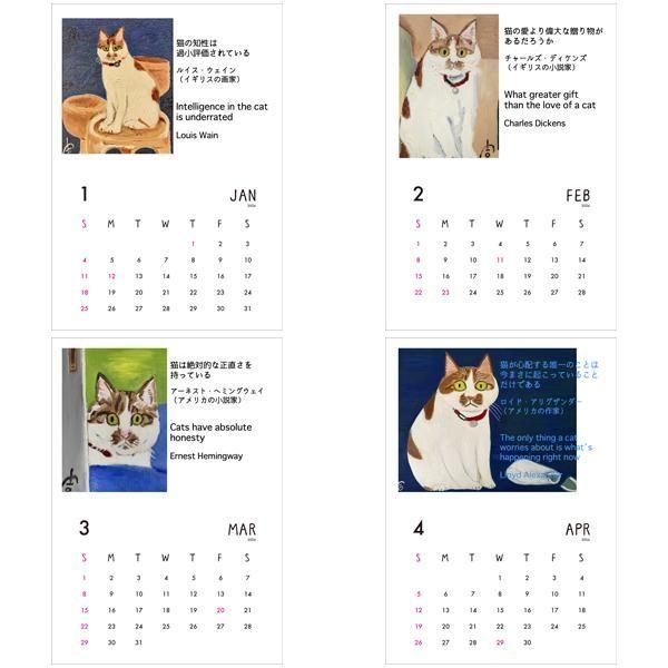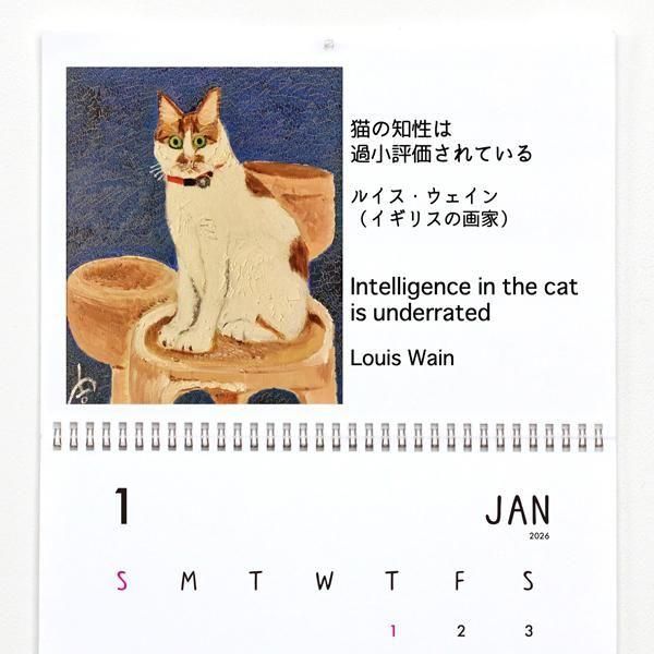 自作の猫の絵と一緒に、世界の著名人による猫についての格言(日本語、英語)を月毎に掲載しました。猫好きな画家ルイス・ウェインに始まり、ディケンズ、ヘミングウェイ、フロイト、リンカーン、レオナルド・ダ・ヴィンチまで、あの偉人も猫の前では私たちと同じことを考えるのか⁉︎と名言に感心しながら、絵と格言で1年を2倍楽しめるカレンダーです。私自身、こんなカレンダーあればいいなという思いから作りました。