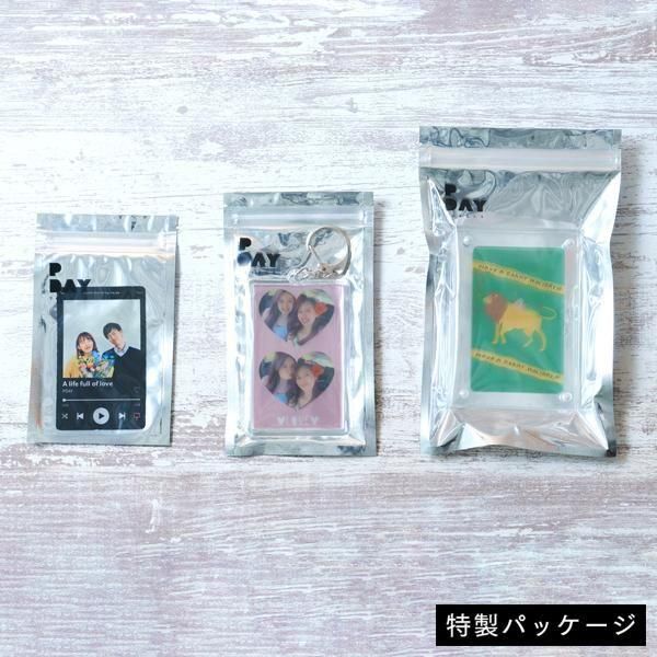 チェキや一般的なカード(86×54mm)と同じサイズのトレカです。耐久性に優れ、適度なハリと静電気が発生しにくい透明PET紙に印刷しています。アルバムに入れて眺めたり、スマホケースに入れたりと自由にお楽しみください。