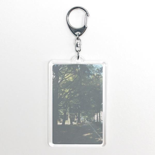透明トレカをキーホルダーに挟んだものです。かばんにつけたりして持ち歩けます。